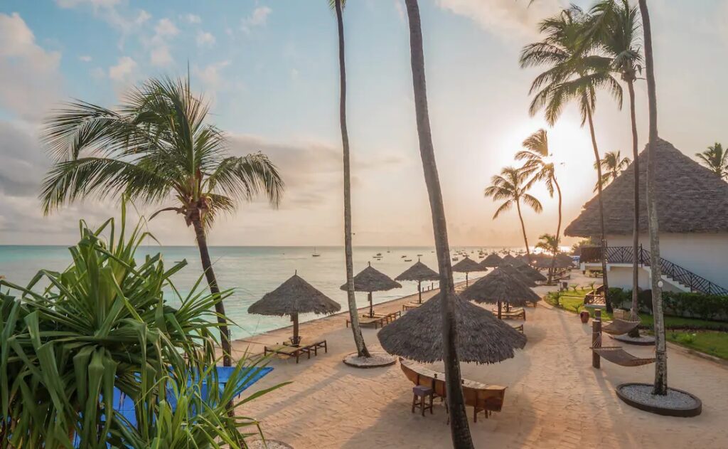 Book a luxury beach resort set within exotic tropical gardens on the beachfront of Zanzibar inviting guests to enjoy the pristine sea views.