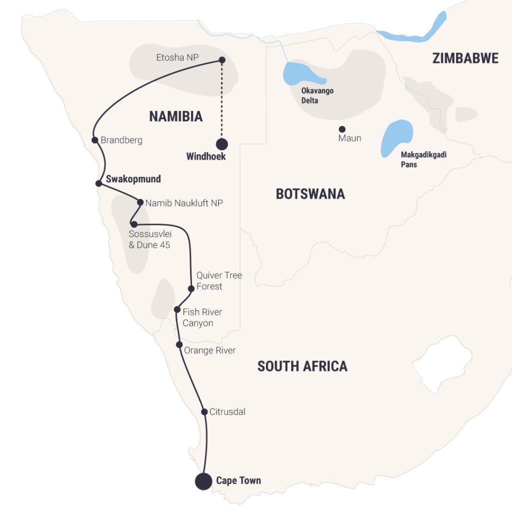 An 11-day comfort tour from Cape Town to Windhoek, exploring Namibia’s deserts, canyons, Swakopmund, Dune 45, and Etosha National Park.