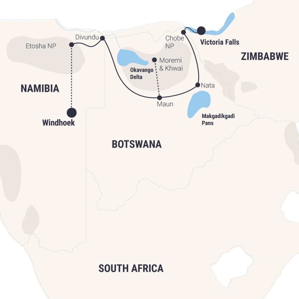 A 10-day overland safari from Windhoek to Victoria Falls, exploring Etosha’s wildlife, the Okavango Delta’s waterways, and Chobe’s elephant-rich landscapes.